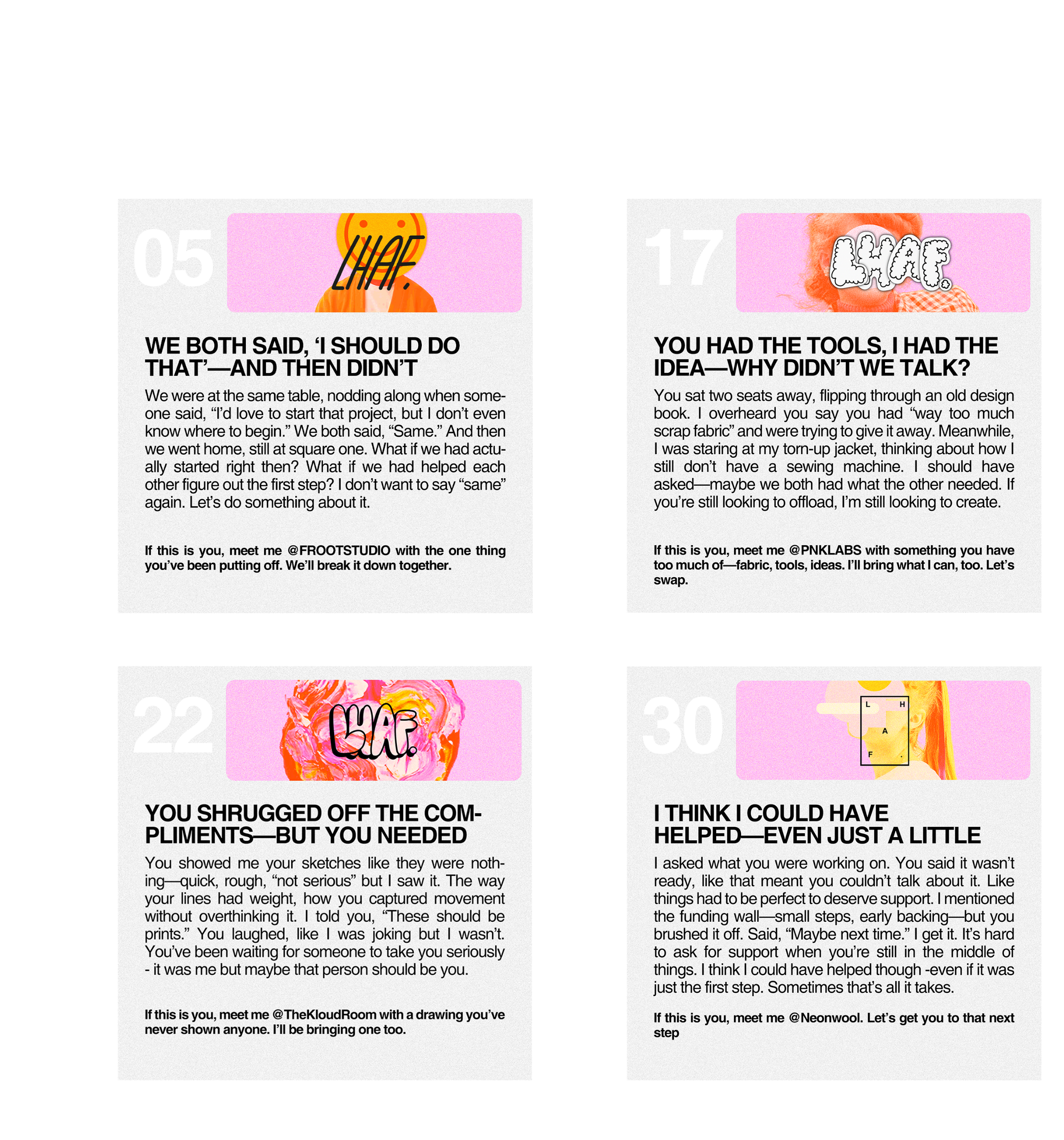 You’ve always wanted to find your people—the ones who really get what you do, who inspire you and help you grow. But networking usually feels awkward, forced, or like you have to prove yourself. LHAF does things differently. We take the time to get to know you beforehand—what you’re looking for, what you bring, and what kind of connections you’d love to make—so when it’s time to meet others, it feels a lot more natural, and a lot less awkward.